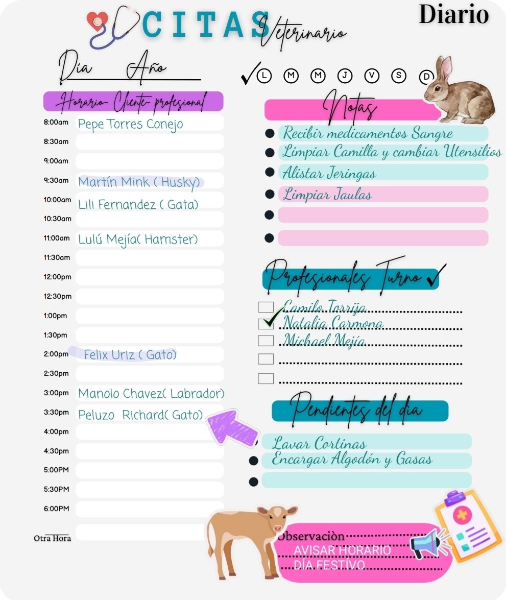 Implementar este planificador en tu rutina diaria no solo simplifica la organización de tus actividades, sino que también reduce errores administrativos y mejora la satisfacción de tus clientes. Al tener un registro claro y accesible en tu idioma, puedes concentrarte en brindar la mejor atención veterinaria posible. Es una herramienta esencial para cualquier profesional en el sector que busque optimizar su tiempo y recursos.